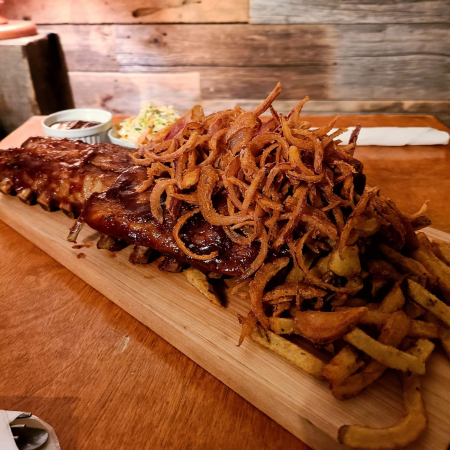 Côtes Levées BBQ, Frites, Oignons Frits et salade de choux